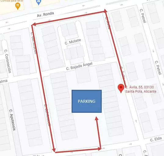 The entrance is on calle Elda, a perpendicular street. You can park on any space with the letter: J4