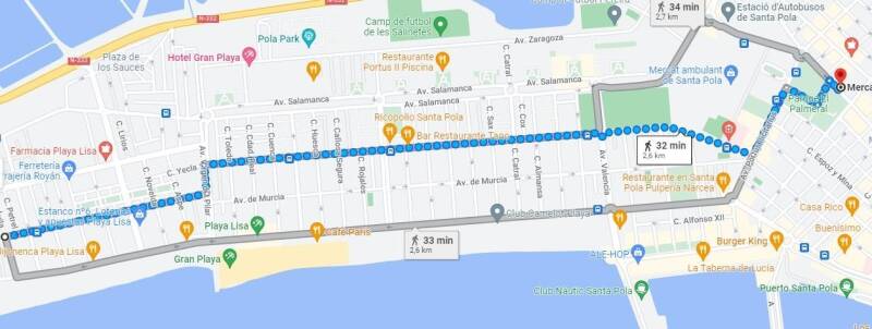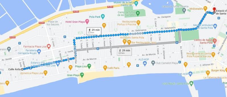 Santa Pola cuenta con una nueva estación de autobuses, desde la que también puedes viajar a Alicante o Elche, entre otros destinos. Está algo alejada del apartamento, a unos 30 minutos andando, cerca del restaurante McDonald’s.